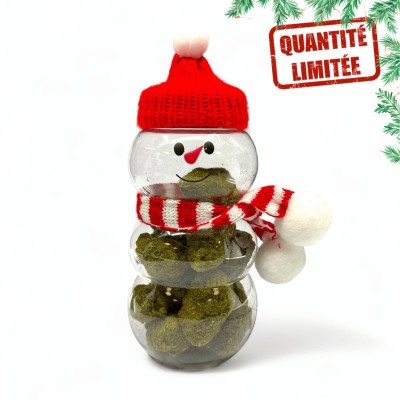 Offrez-vous la magie des fêtes avec notre collection Frozen CBD présentée dans un adorable packaging bonhomme de neige. Cette édition spéciale Noël contient 20 grammes de fleurs CBD premium soigneusement sélectionnées, conservées dans un contenant en verre à trois compartiments orné d'un bonnet rouge tricoté et d'une écharpe rayée festive.