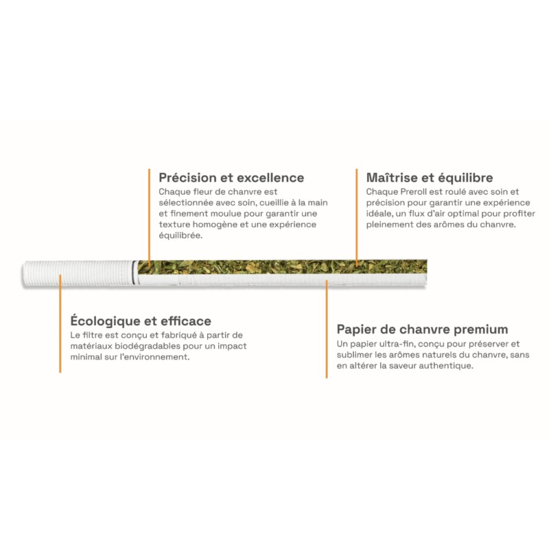 Fabriquées exclusivement à partir de fleurs de chanvre cultivées sans pesticides, ces cigarettes offrent un mélange équilibré de cannabinoïdes pour une expérience pure et authentique. Chaque unité est soigneusement testée en laboratoire, garantissant une qualité constante et une sécurité optimale pour votre bien-être quotidien.